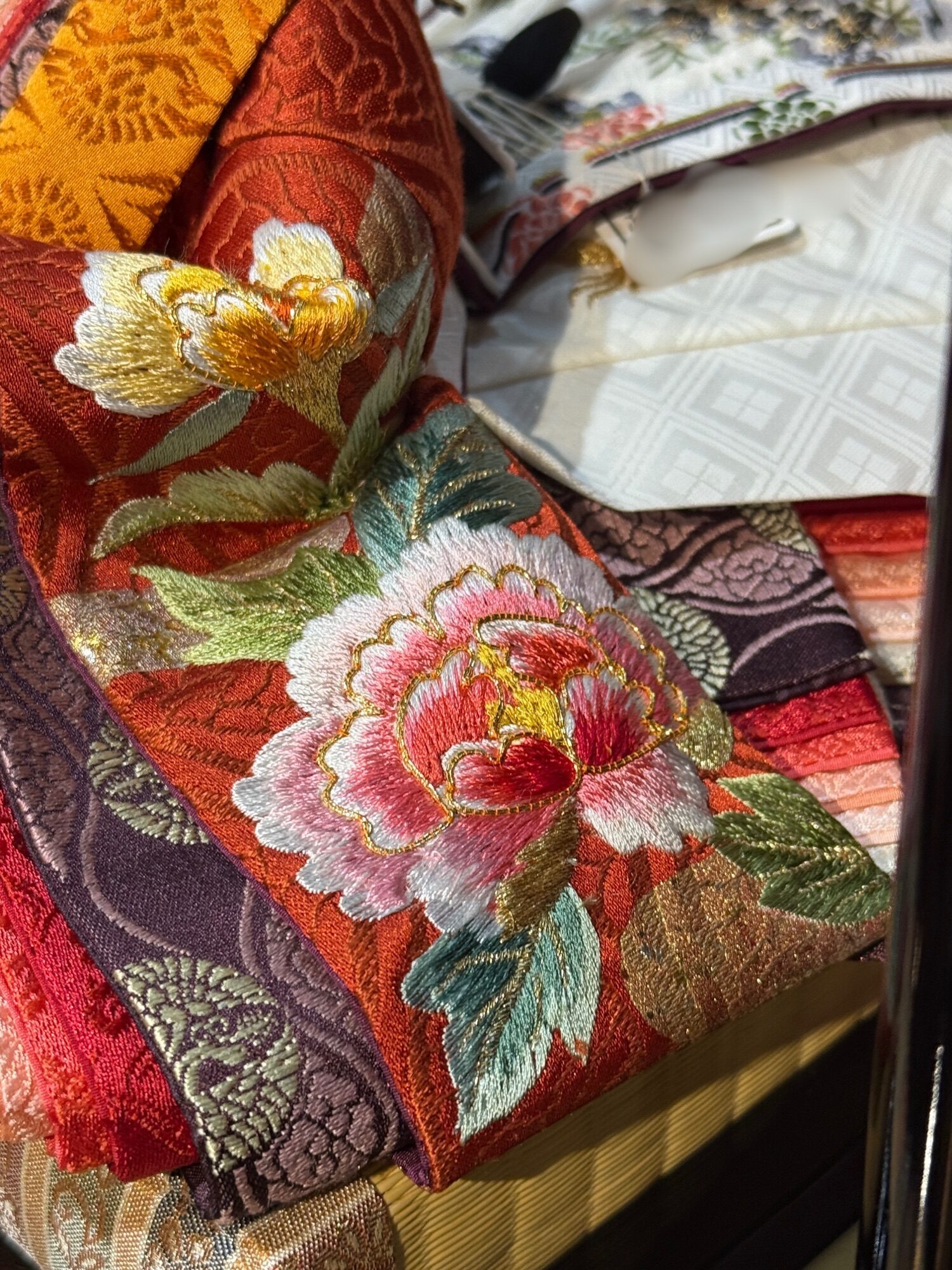 正絹ならではの艶やかな発色に、牡丹の花が繊細な色使いで丁寧に、かつ迫力のある佇まいで刺繍されております。