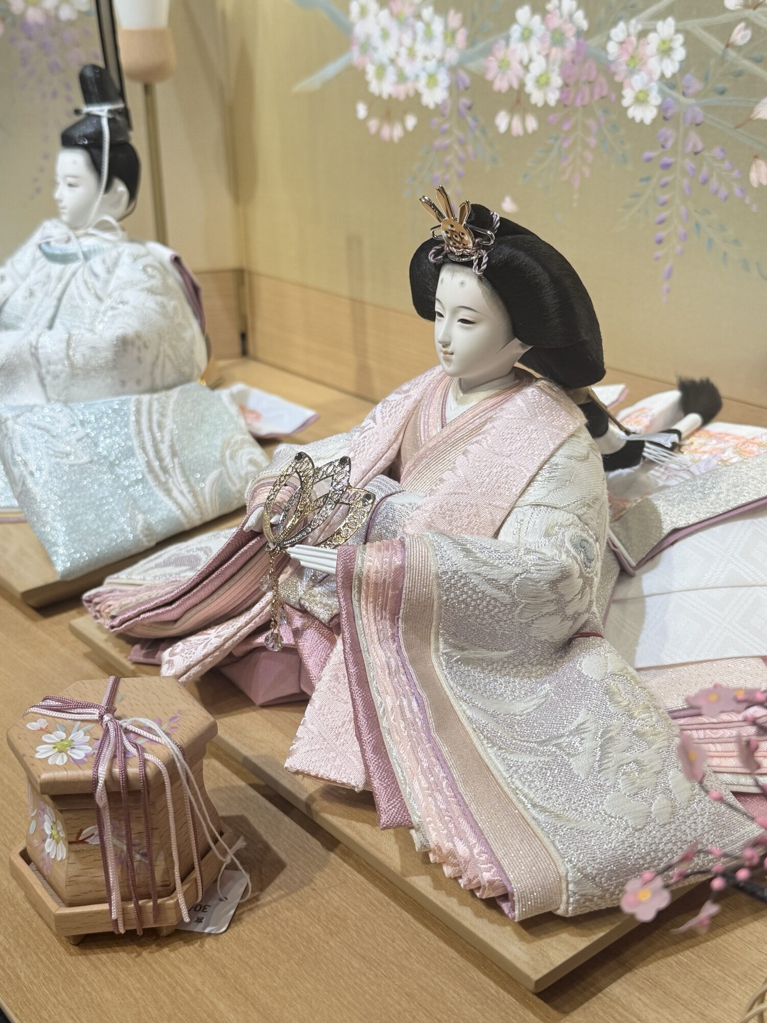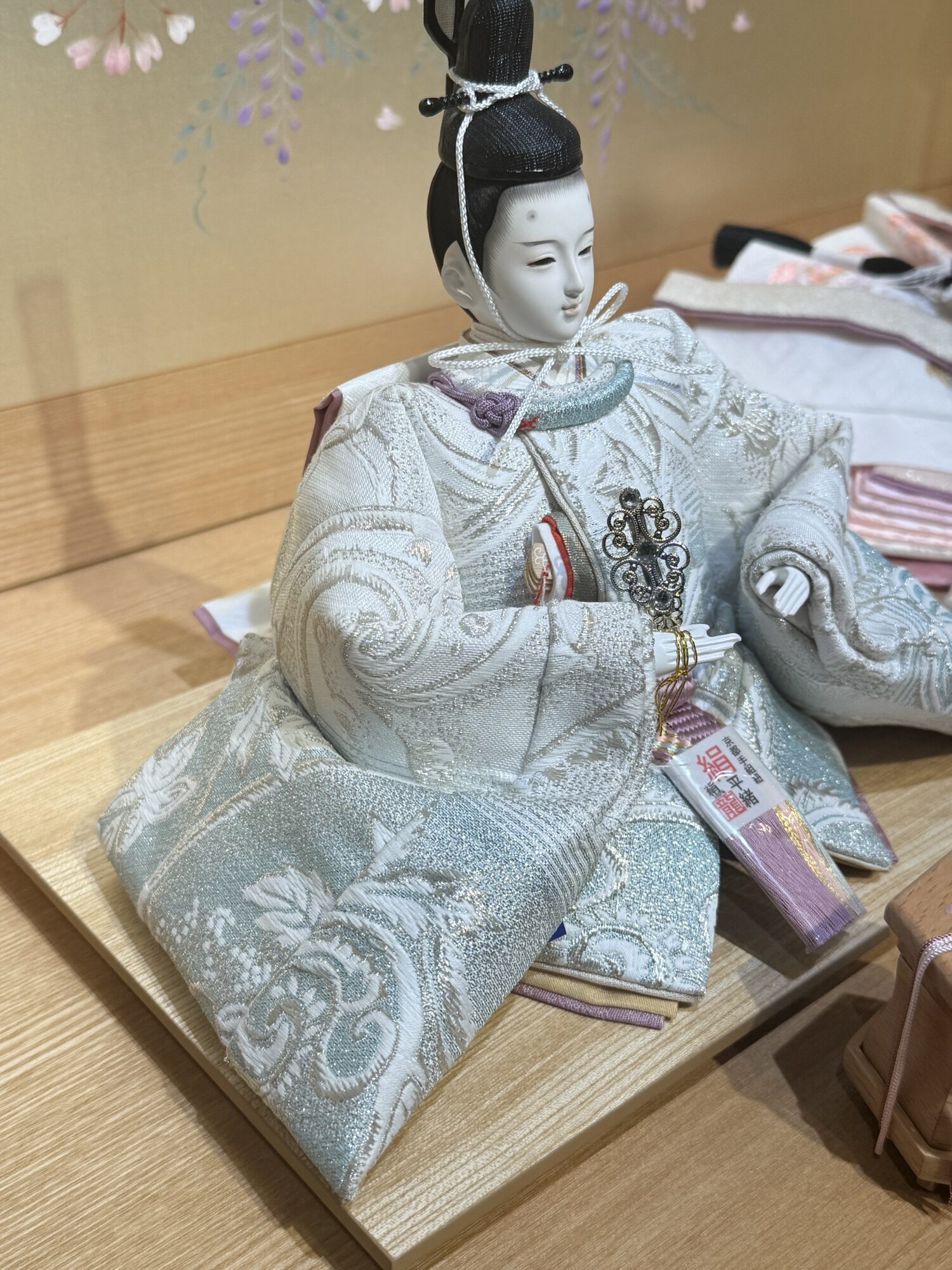 女雛のお衣装は、散らし桜 を基調とした意匠。
